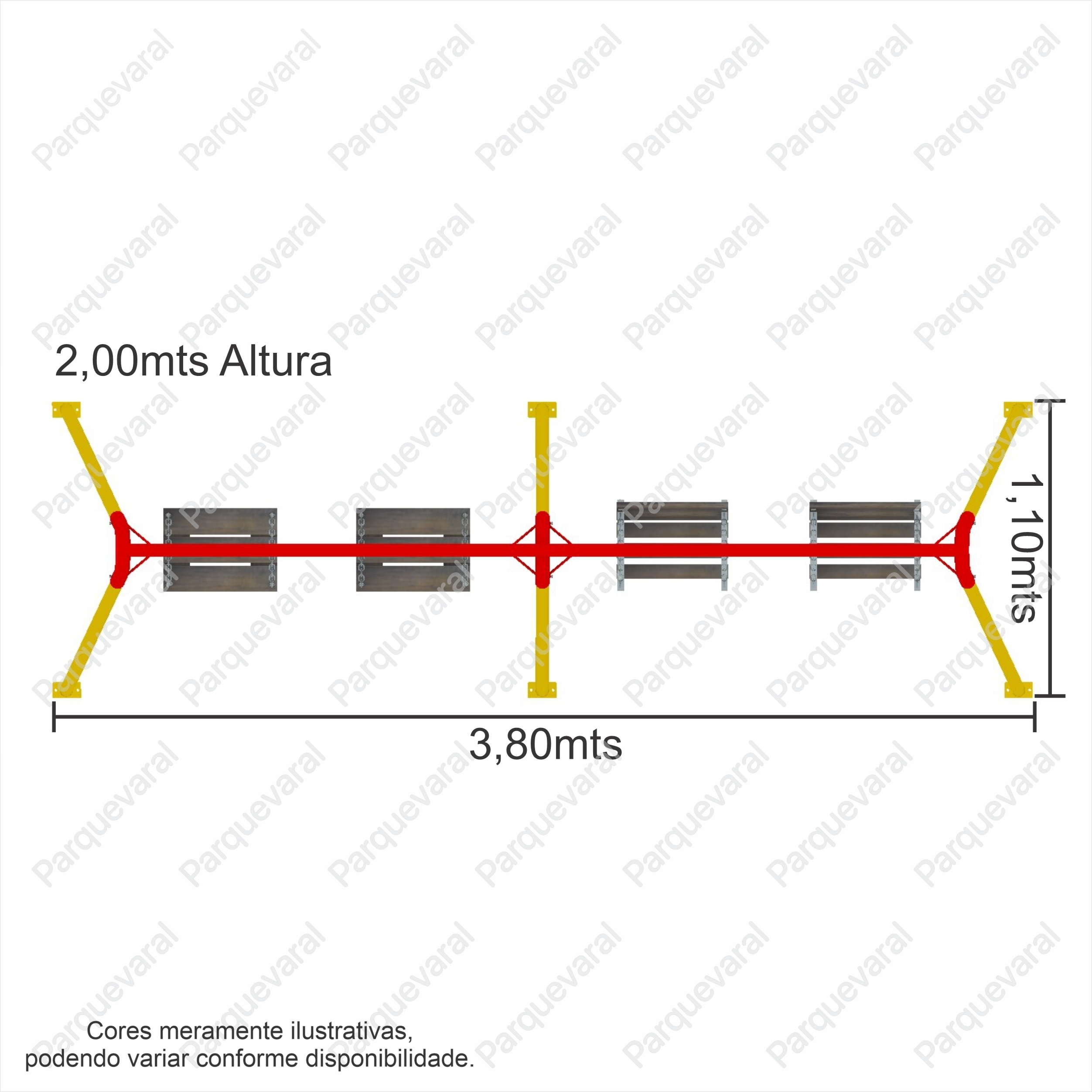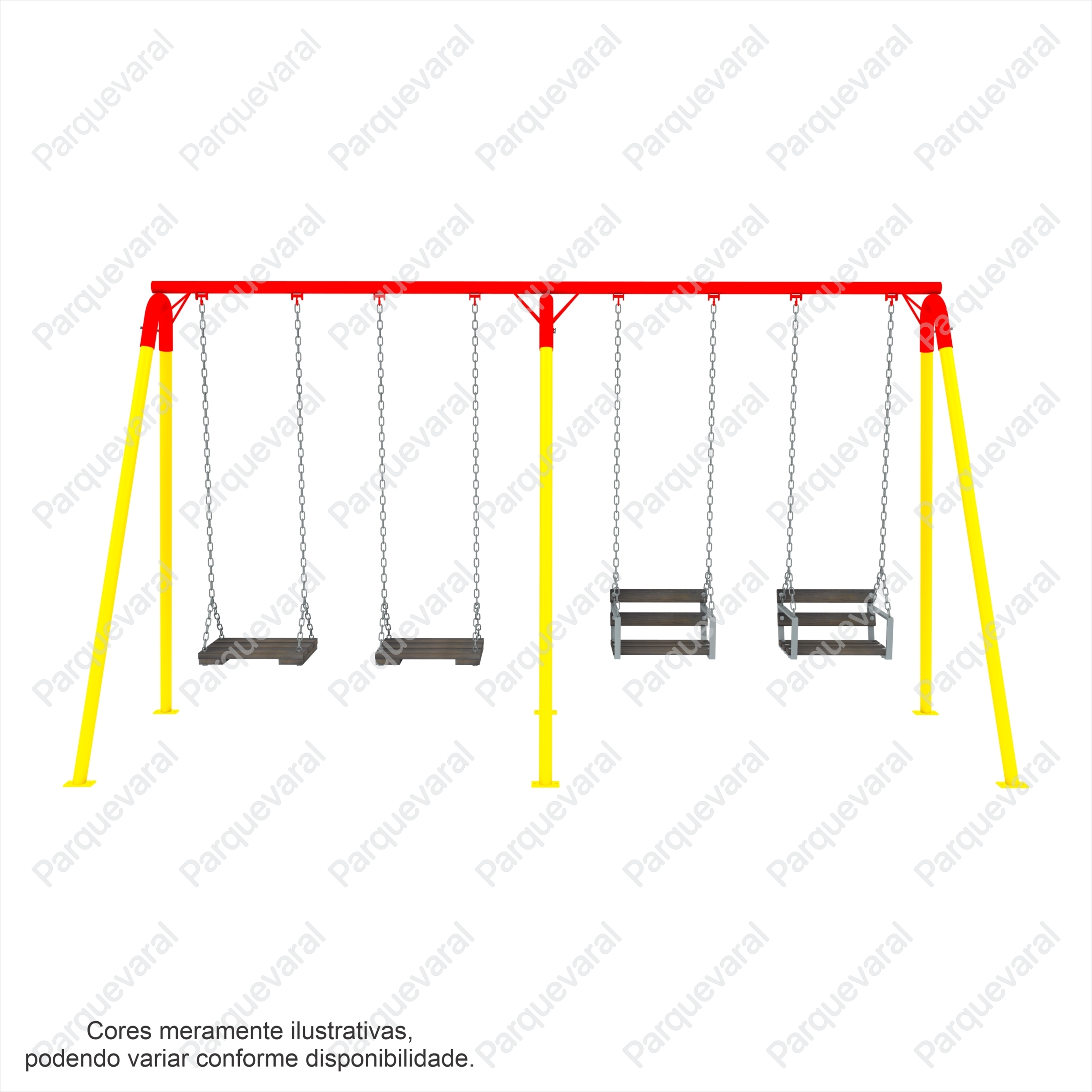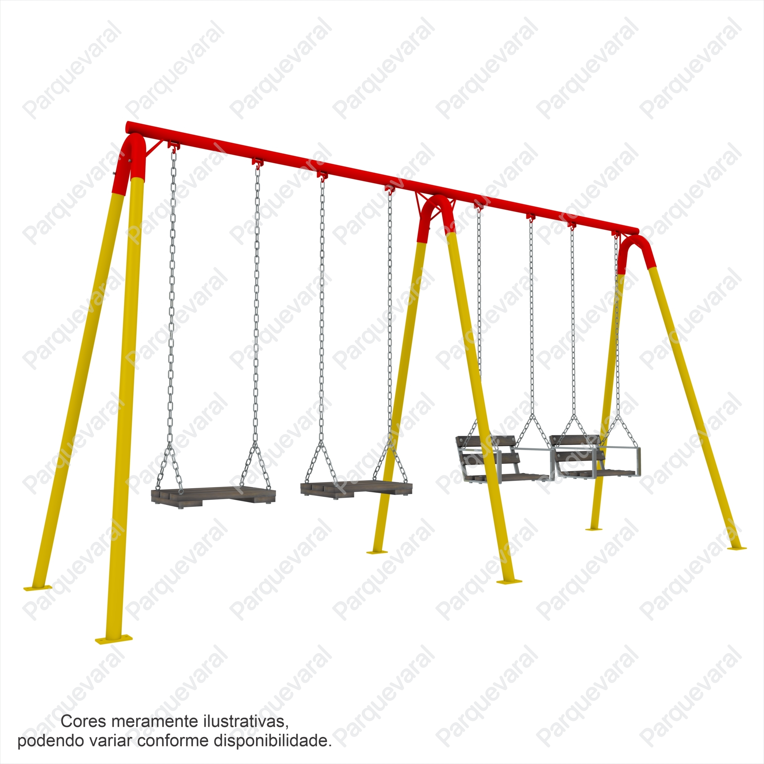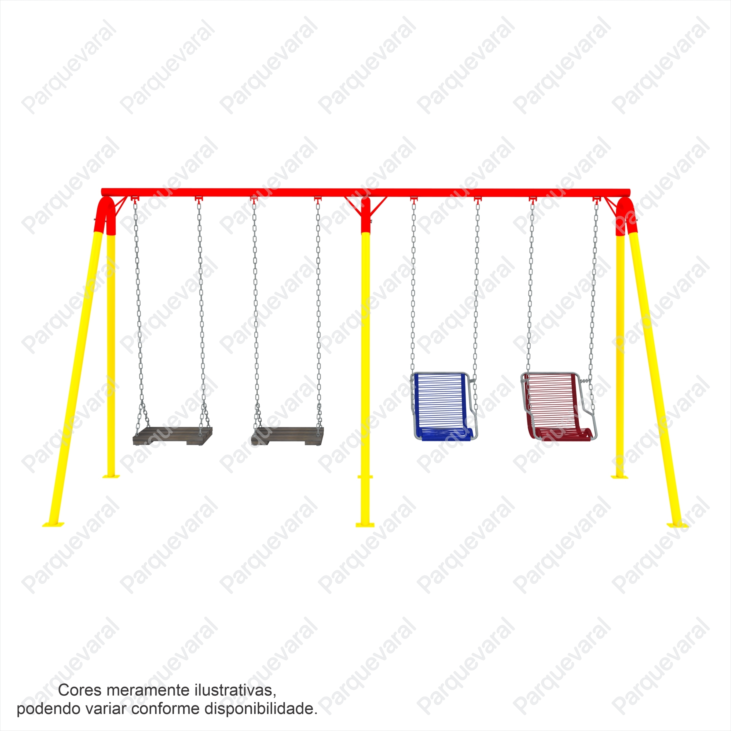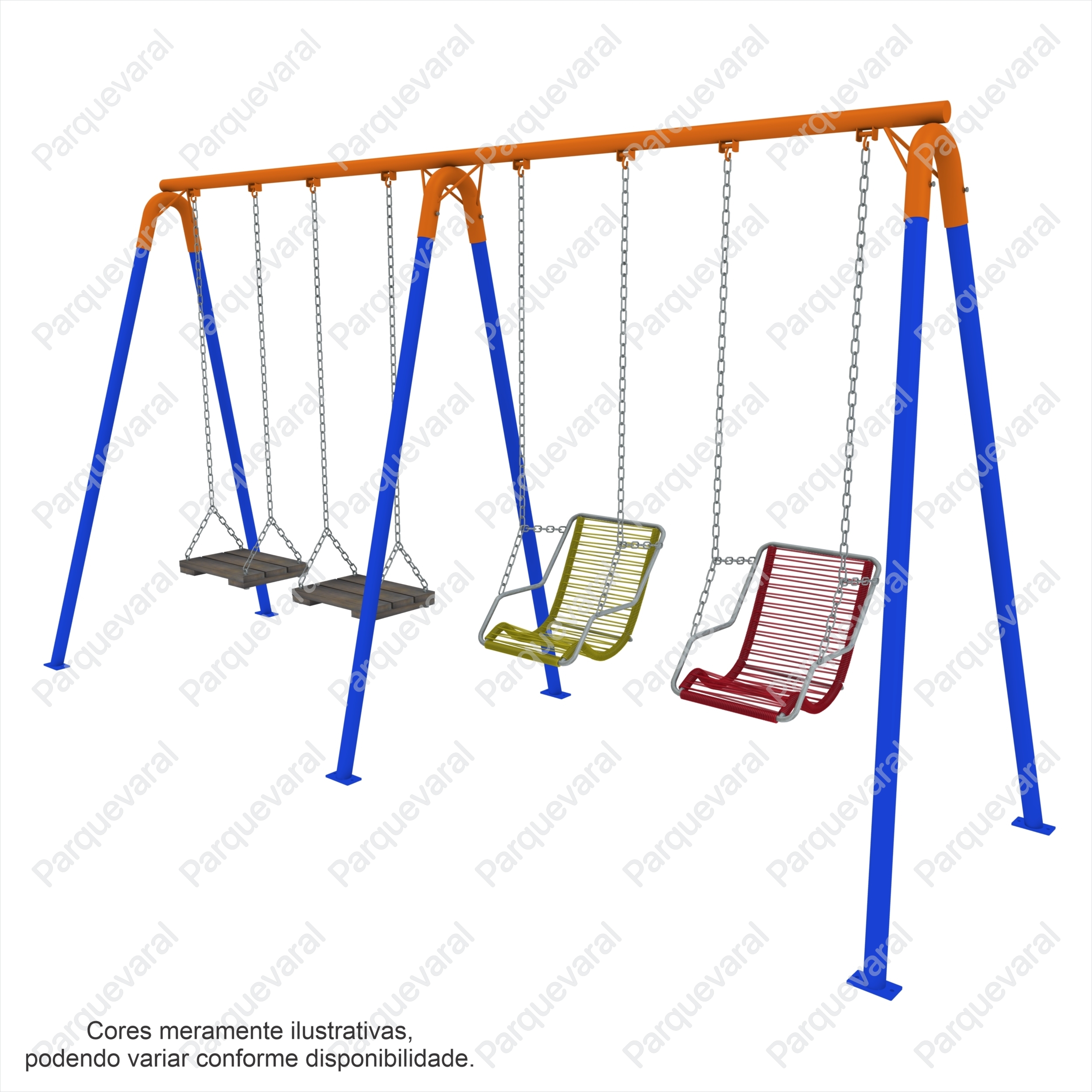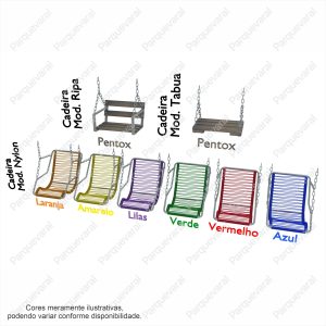 Confecção: Estrutura em tubo de aço, cadeira sustentada por corrente de elo longo 4mm, balanço fixo (precisa fixar no chão com bucha e parafuso ou chumbar)