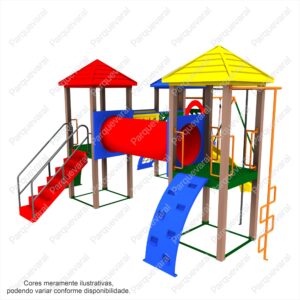 Descrição: confeccionado em madeira plástica (pés direitos), ferragens galvanizadas, acabamento colorido em pintura epóxi, fixações feitas com parafusos francês e sextavados utilizando arruelas e porcas travantes, entradas e saídas do brinquedo possuem pegadores / apoios e proteções, conjunto composto por 3 Torres com Cobertura, 1 Passarela Fixa, 1 Tubo de Ligação com 2mts, 1 Balanço com 2 Cadeiras, 1 Escada, 1 Descida de Bombeiros, 2 Rampas de Escalada, 1 Escalada de Cordas, 1 Escalada Alternada e 1 Escorregador .