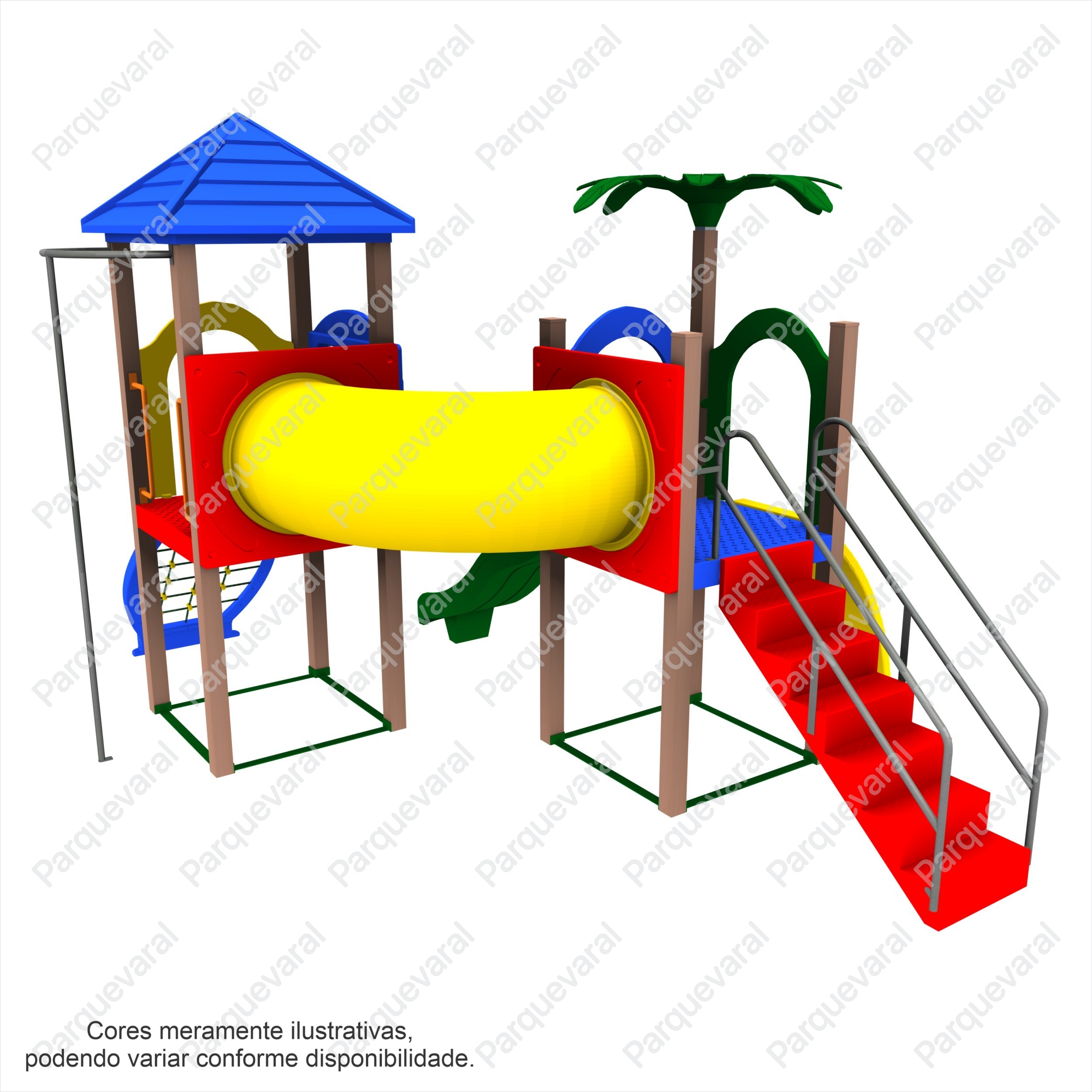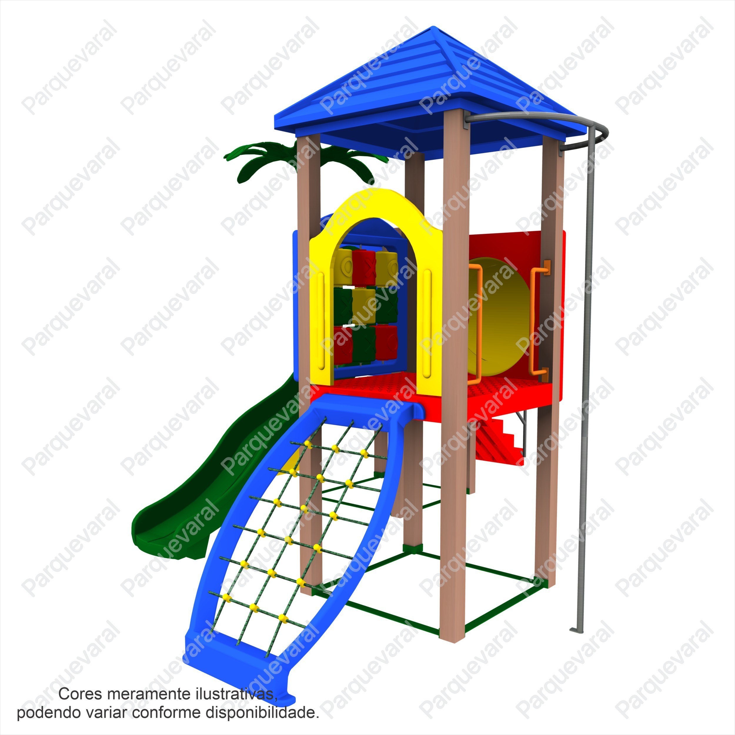 Descrição: confeccionado em madeira plástica (pés direitos), ferragens galvanizadas, acabamento colorido em pintura epóxi, fixações feitas com parafusos francês e sextavados utilizando arruelas e porcas travantes, contem 1 coqueiro decorativo, entradas e saídas do brinquedo possuem pegadores / apoios e proteções, conjunto composto contendo: 1 Escalada de Cordas, 1 Escorregador, 1 Rampa de Escalada, 1 Descida de Bombeiros, 1 Torre com Cobertura, 1 Torre sem Cobertura, 1 Escada, 1 Tubo Curvo de Ligação e 1 Jogo da Velha.