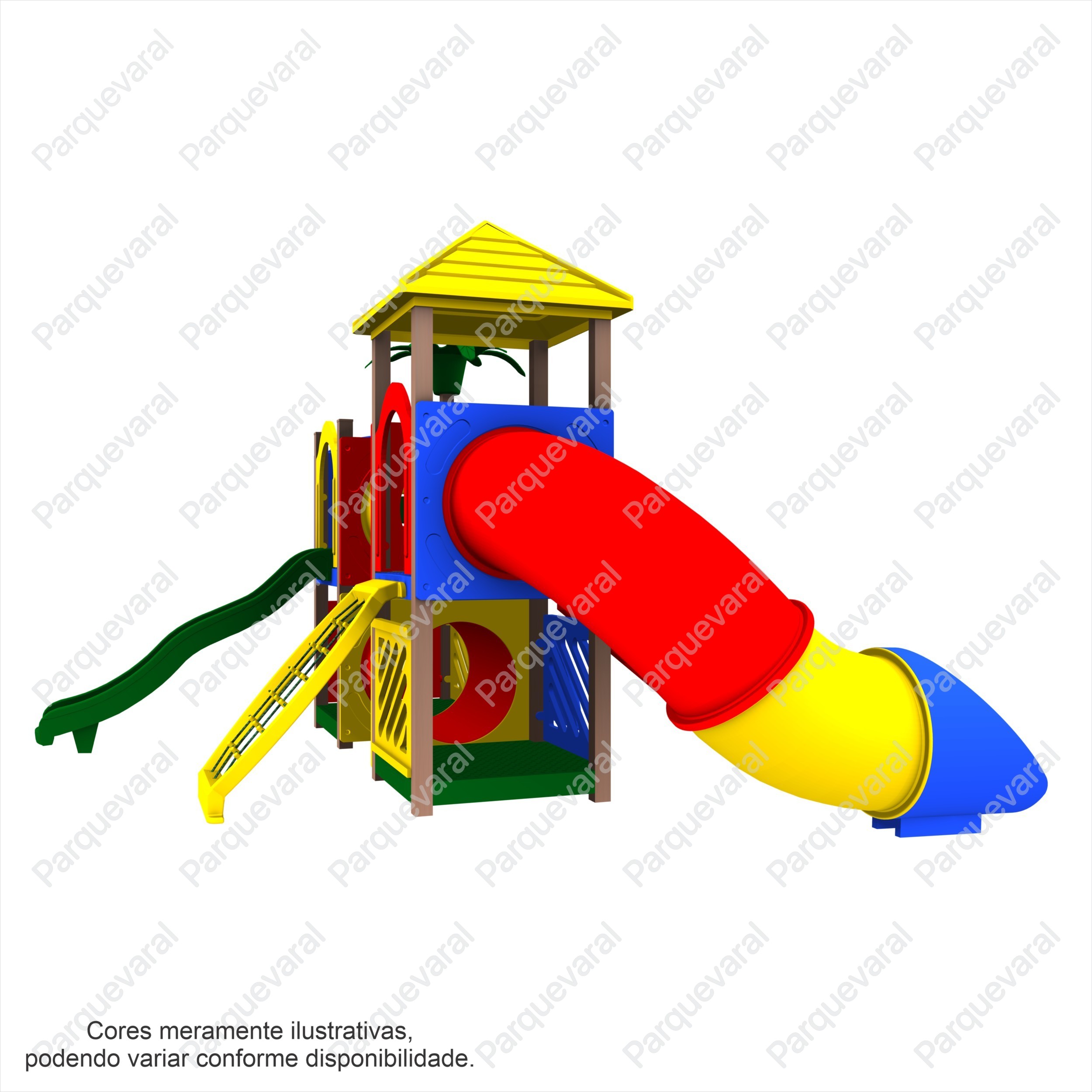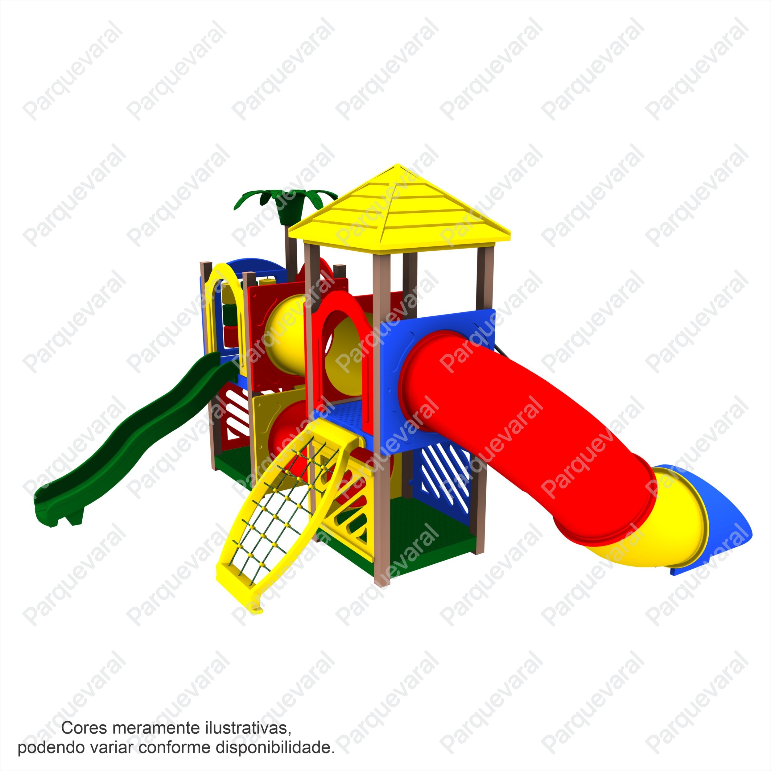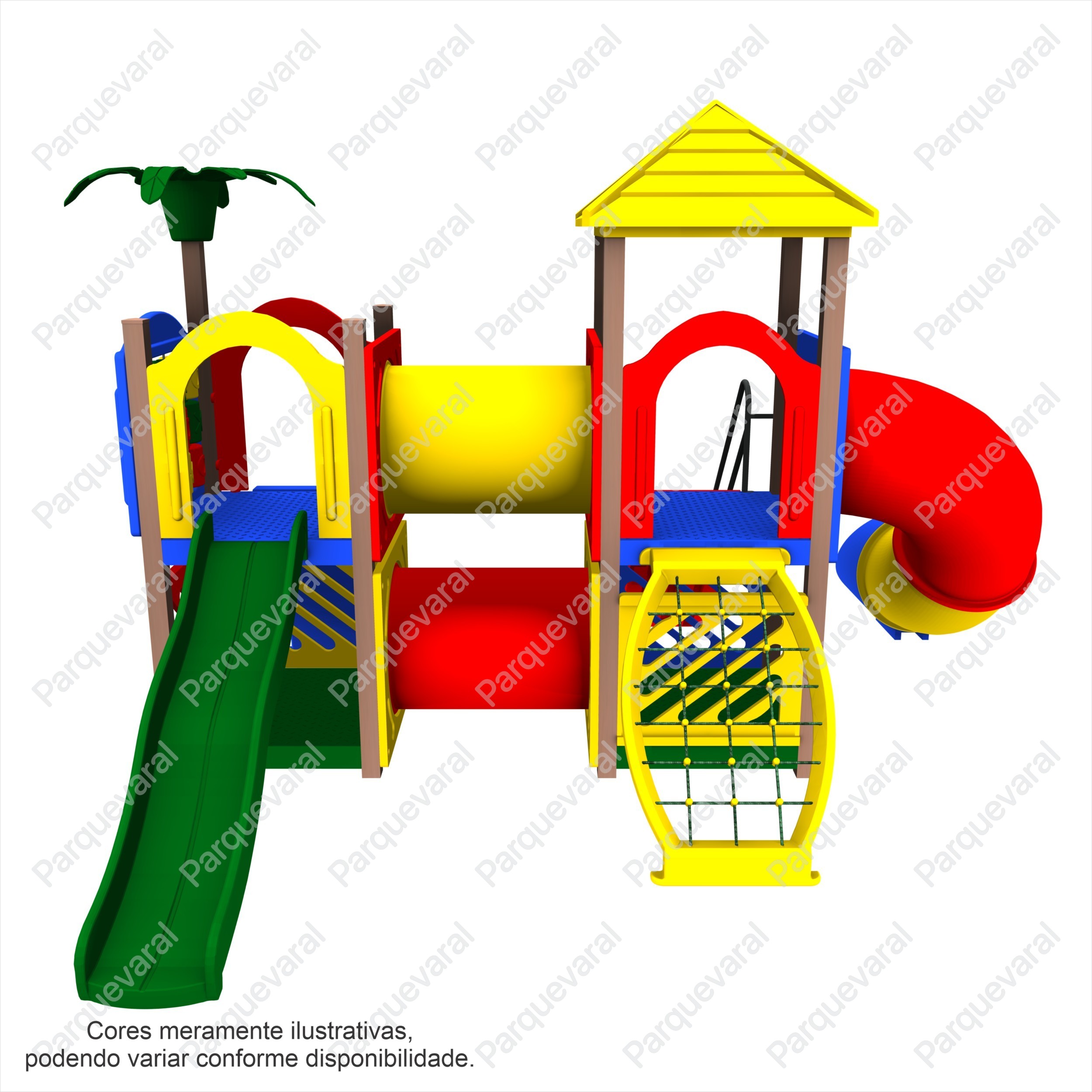 Descrição: confeccionado em madeira plástica (pés direitos), ferragens galvanizadas, acabamento colorido em pintura epóxi, fixações feitas com parafusos francês e sextavados utilizando arruelas e porcas travantes, contem 1 coqueiro decorativo, entradas e saídas do brinquedo possuem pegadores / apoios e proteções, conjunto composto contendo: 1 Escalada de Cordas, 1 Escorregador, 1 Rampa de Escalada, 1 Escada, 1 Torre com Cobertura, 1 Torre sem Cobertura, 1 Tobogã Fechado + Saída, 2 Tubos Retos de Ligação com 1mt de comprimento, 1 Jogo da Velha e 2 Decks Inferiores.