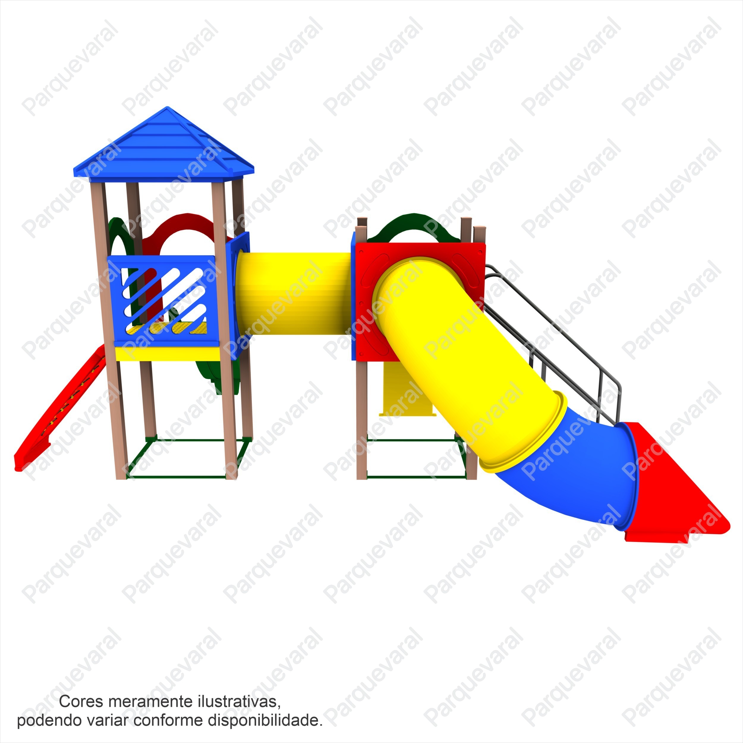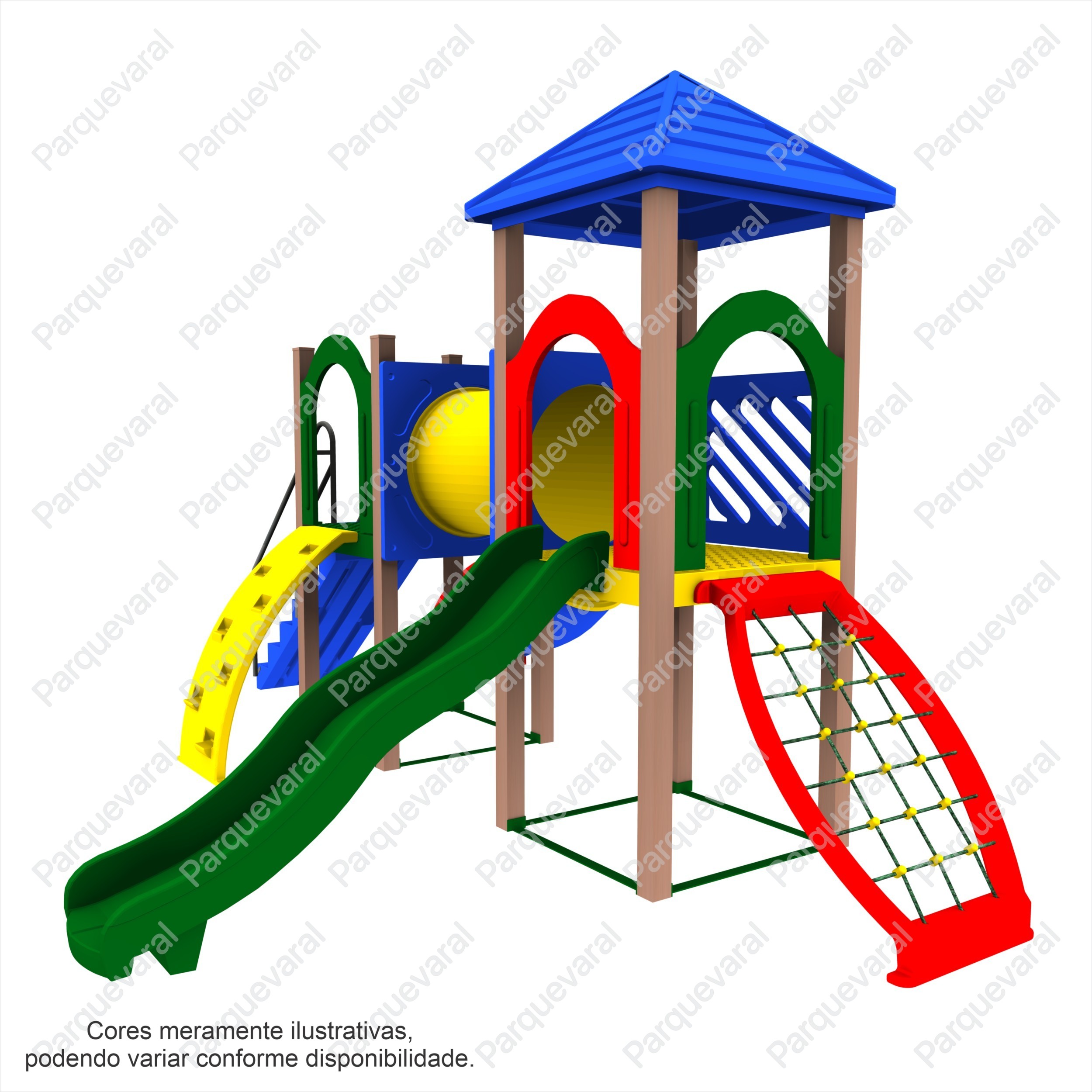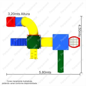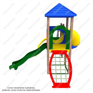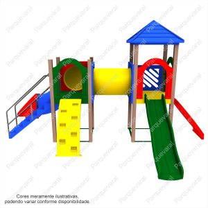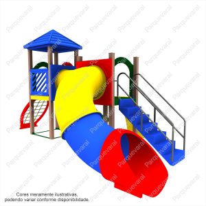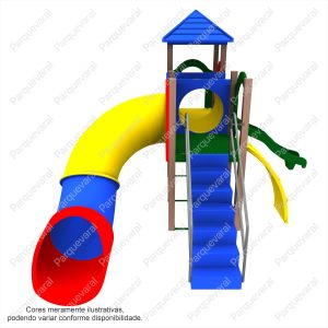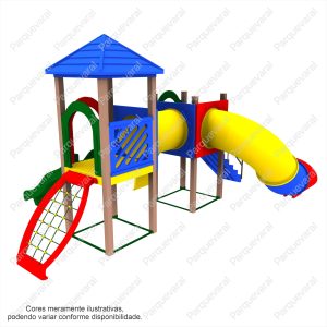 Descrição: confeccionado em madeira plástica (pés direitos e assoalhos), ferragens galvanizadas, acabamento colorido em pintura epóxi, fixações feitas com parafusos francês e sextavados utilizando arruelas e porcas travantes, entradas e saídas do brinquedo possuem pegadores / apoios e proteções, conjunto composto contendo: 1 Tubo de Ligação 1mt, 1 Tobogã Fechado 90º + 45º + Saida Tobogã, 1 Torre Coberta, 1 Torre Descoberta, 1 Escada, 1 Rampa Escalada, 1 Malha de Cordas, 1 Pista 2,30mts Ondulada – Rotomoldada.